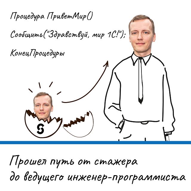 Моим наставником в отделе стал Дима Гостищев (ведущий программист отдела развития и инноваций). Несмотря на то, что для него это был первый опыт обучения, он подошел к своей задаче очень серьезно и даже скрупулезно. За время моей стажировки и далее мы с нуля прошли все материалы, которые есть в мире 1С, и оба научились тому, как обучать людей.