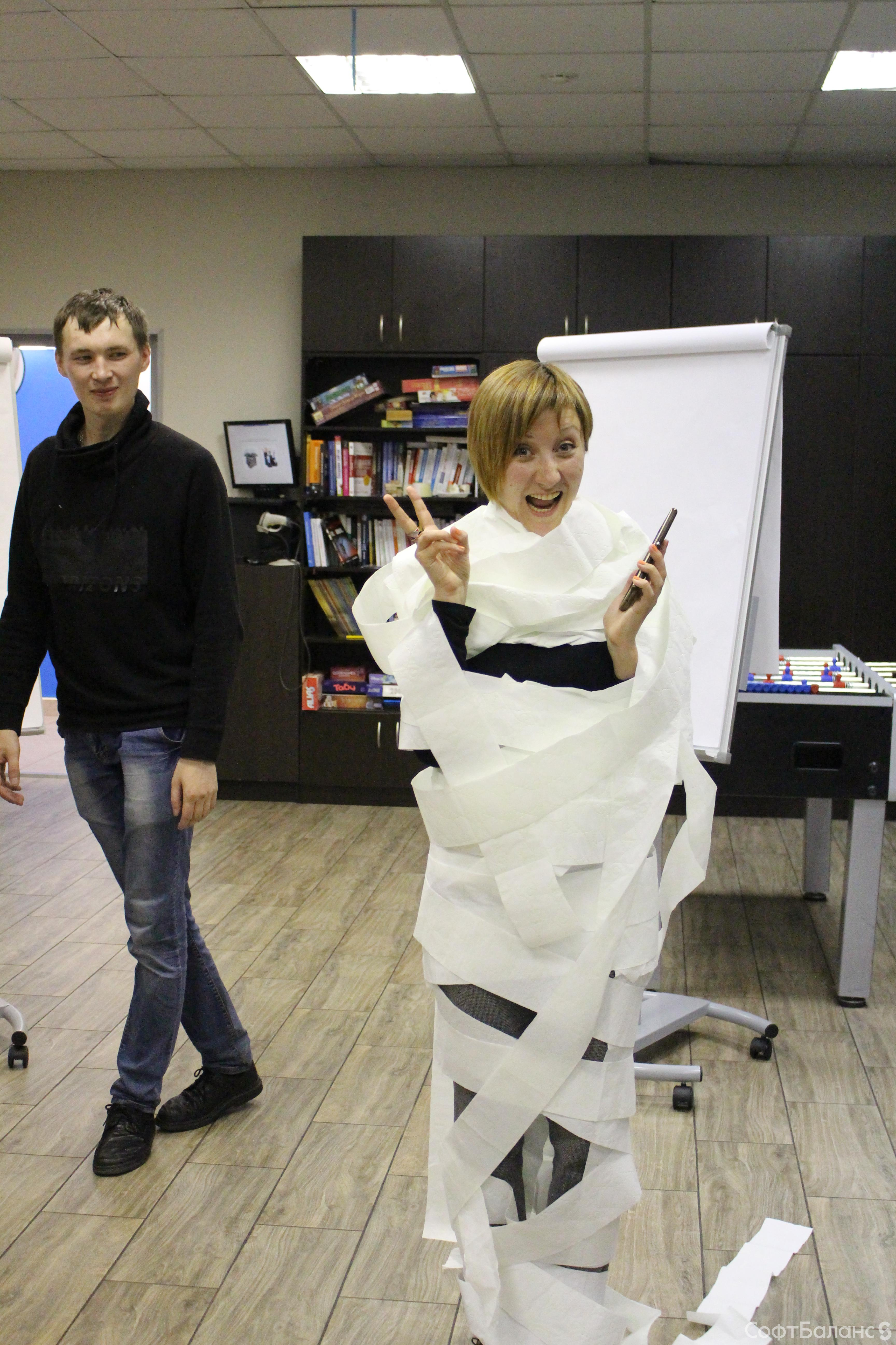 Вечером мы все собрались в комнате отдыха, где ели торт-сюрприз, приготовленный специально к этому дню, и другие закуски. А когда все угощения были опробованы, приступили к играм, которые повеселили и участников, и зрителей. Например, мы выяснили, что в наших программистов влезает практически неограниченное количество карамелек, а настоящая мумия отличается от ненастоящей тем, что у нее обязательно должна быть замотана голова.
