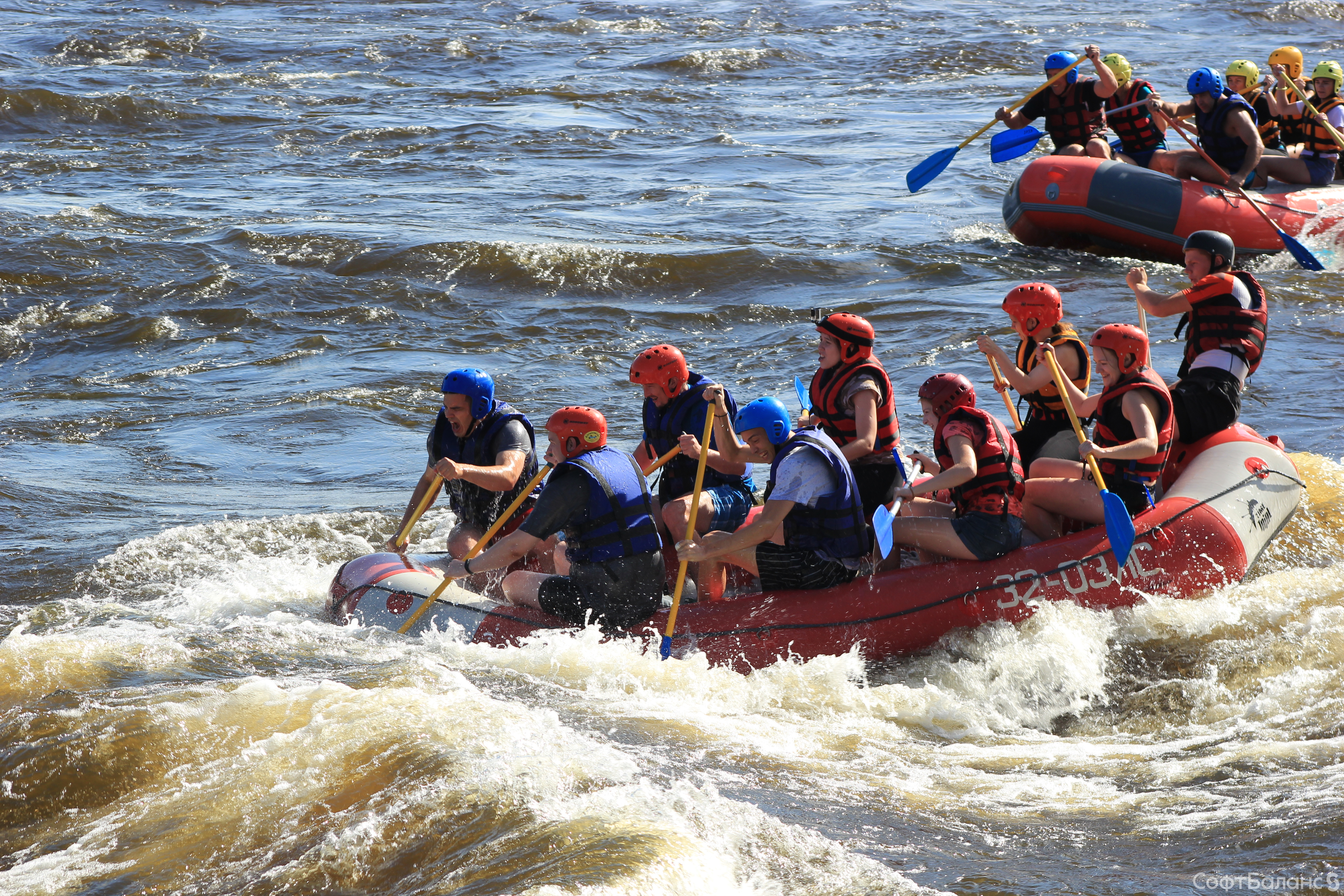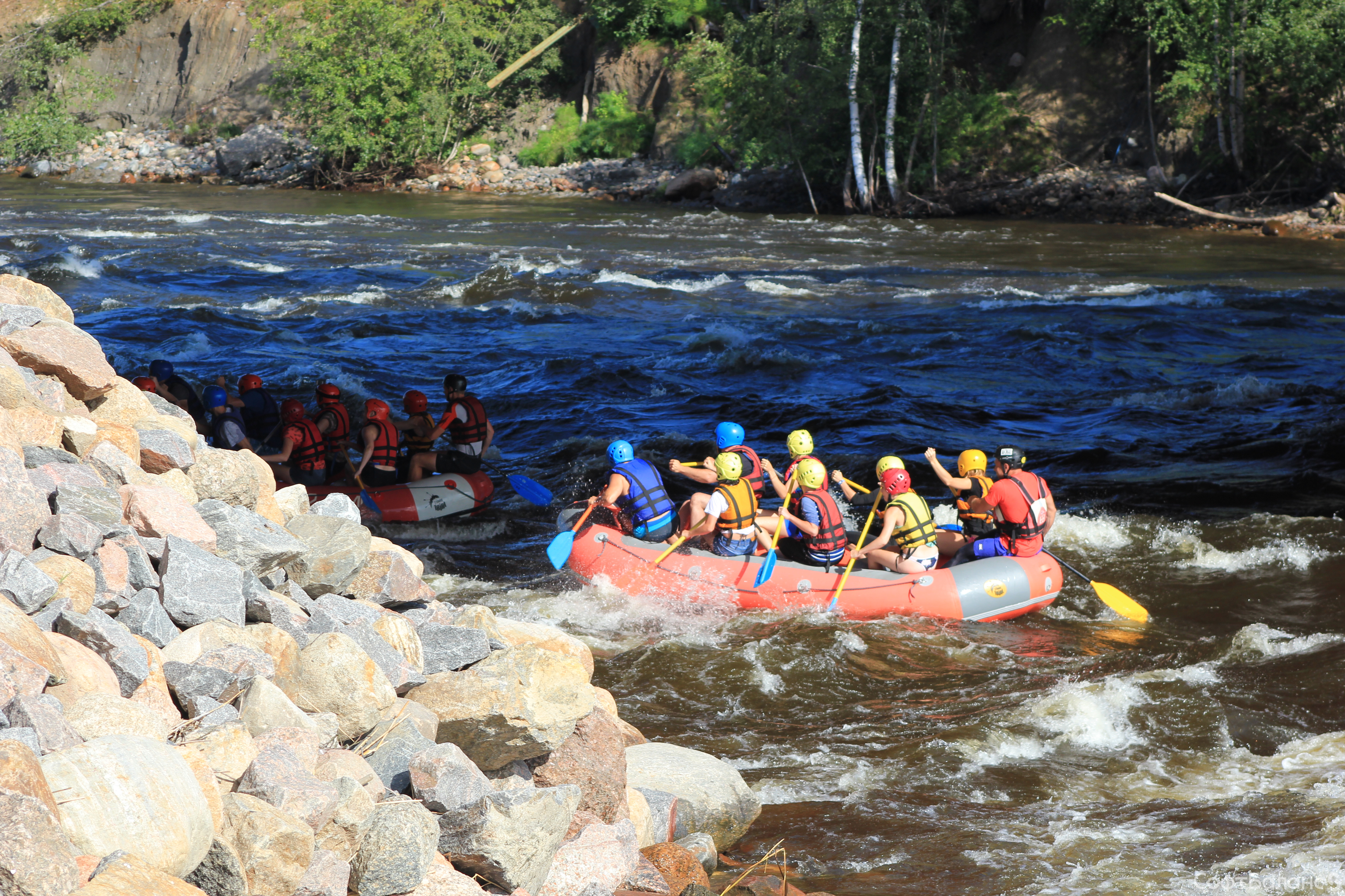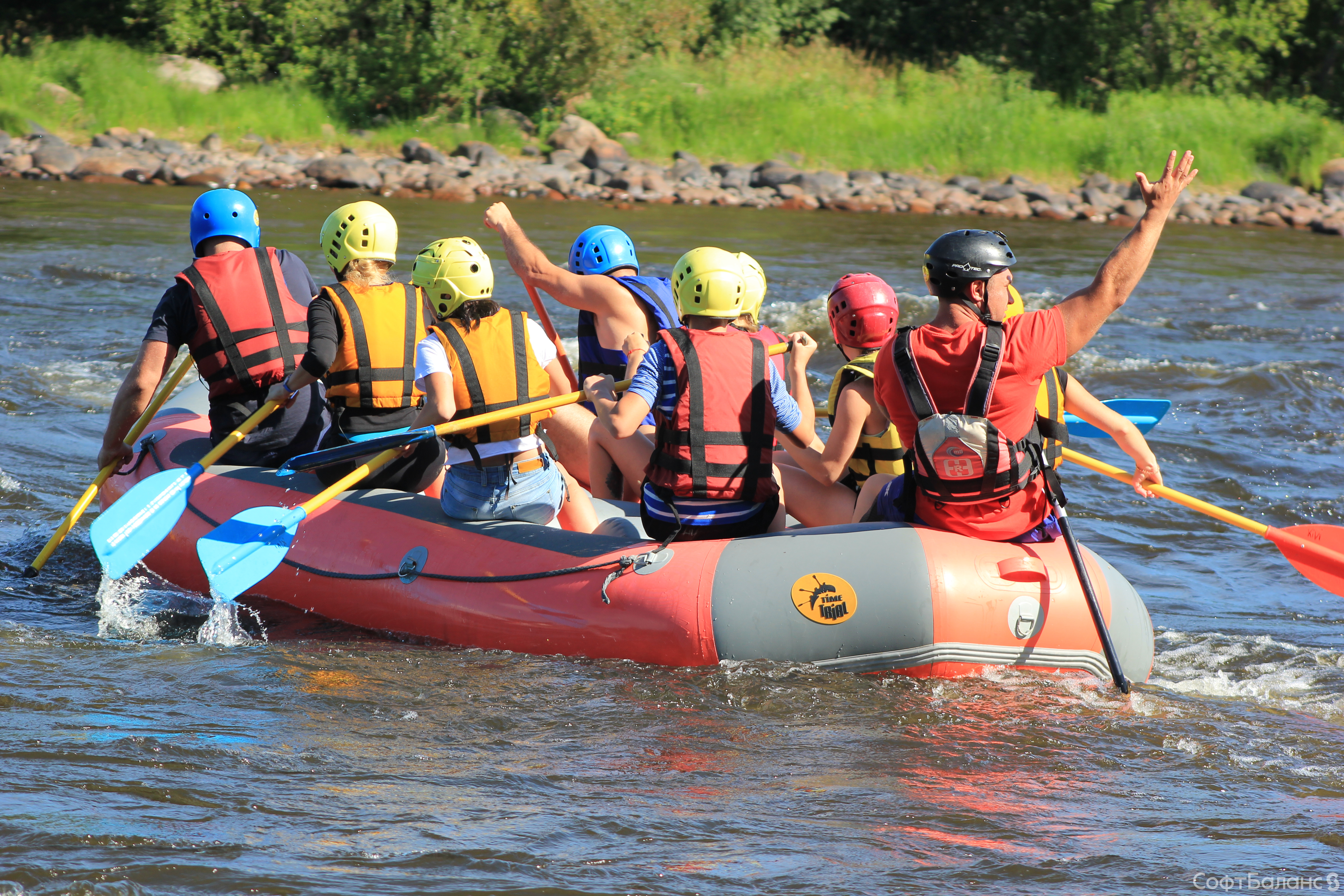 Субботний день 11 августа для Департамента Обеспечения и Развития прошел под девизом «Несем спорт в массы!», ведь мы отправились на рафтинг в Лосево. Для многих этот сплав стал дебютным и подарил непередаваемые эмоции! Коллеги из Департамента были разделены на команды, конечно же, каждая со своим капитаном и названием. Для начала мы немного потренировались – и сплавляться, и лодку таскать: спасибо сильному мужскому плечу, но и некоторым девушкам также досталась эта почетная миссия. Но справились все на ура! А затем приступили к соревнованиям: спуск по горной реке на скорость, да еще когда нужно коснуться трофея быстрее других команд, – это было действительно захватывающе! Все команды очень старались победить, но призы на берегу достались в итоге всем – брызги шампанского и купание в озере! А самое главное – веселье и положительные эмоции!