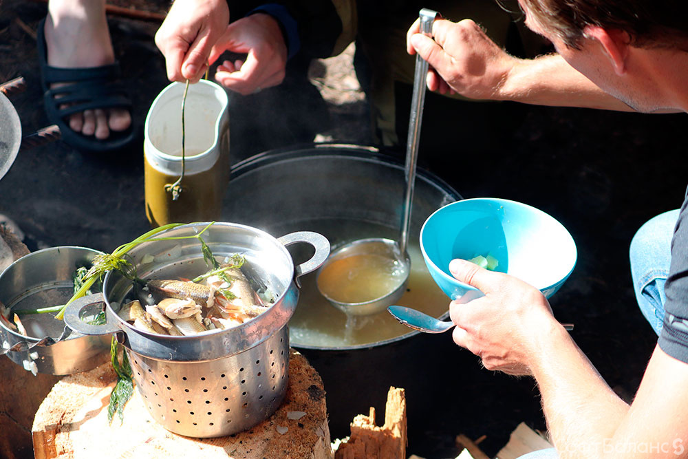 Мужчины провели это время с пользой - поймали щуку, множество уклеек, плотвичек, окуней, красноперок, густер и подлещиков (несколько сотен штук и более 6 кг). Улов закоптили и сварили двойную уху по уникальному рецепту, придуманному исключительно для ЖМР :) Конечно, не обошлось без жареного мяса на костре (нога поросенка весом 9 кг), салата и 20 кг плова из баранины, который был съеден в рекордный срок!