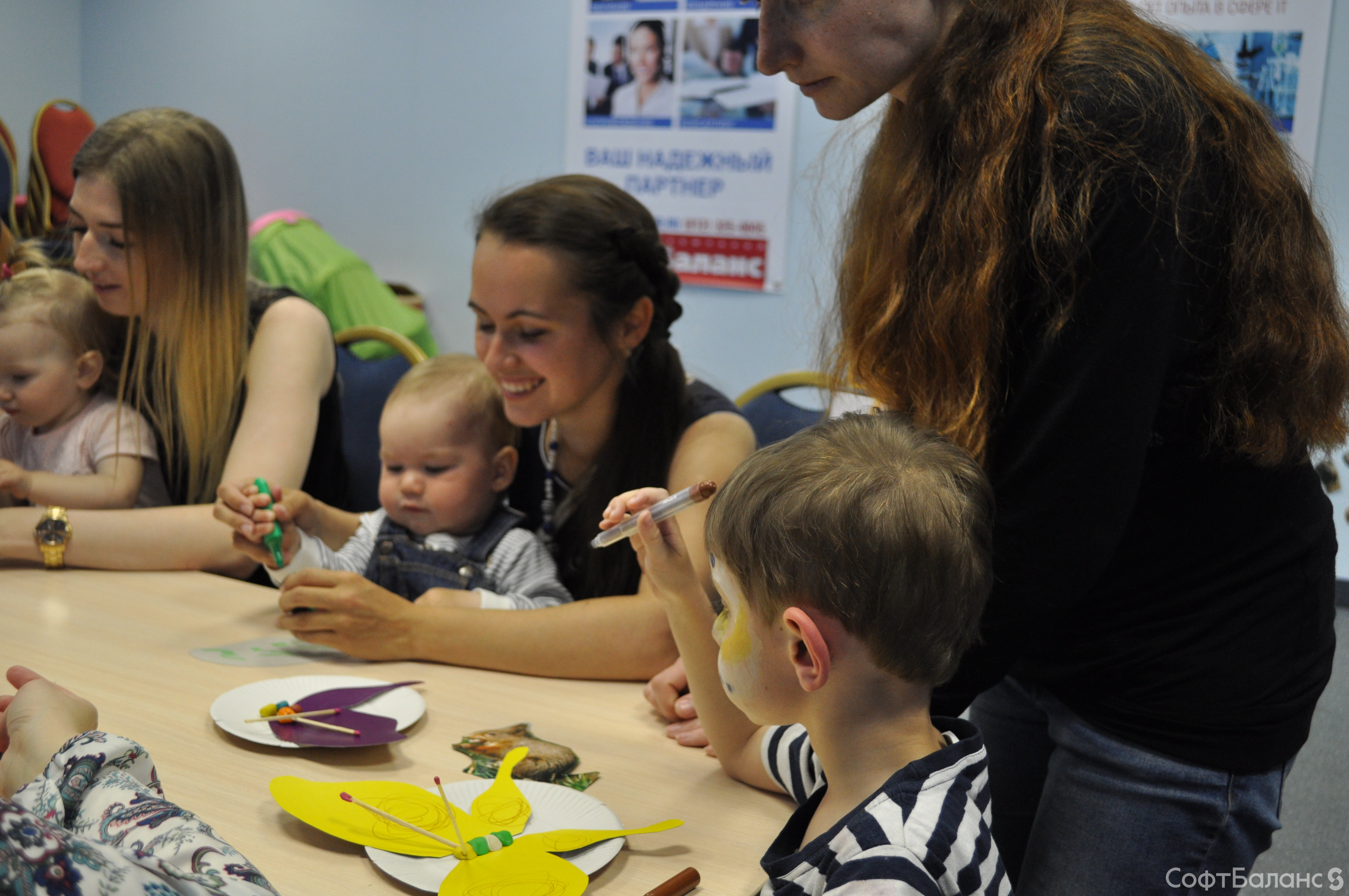 Малыши тоже не скучали: сначала они посмотрели замечательную добрую сказку-спектакль с красочными декорациями и милыми актерами-обезьянками и мотыльком, которого исполнил президент компании – Владимир Каменецкий, а после лепили бабочек из пластилина.
