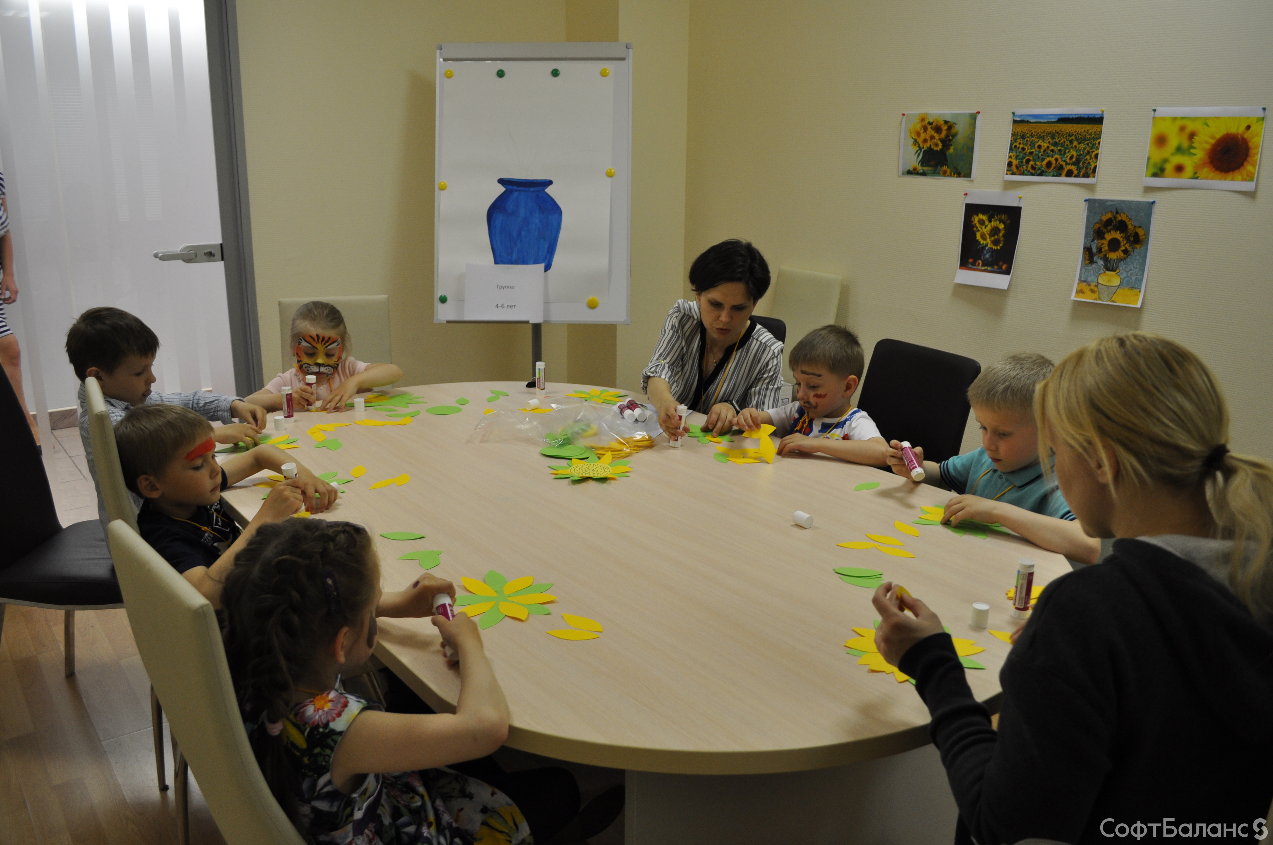 Детки постарше сделали замечательную аппликацию натюрморта – вазу с подсолнухами. Не обошлось и без активных конкурсов – собирали на скорость башню из бумажных стаканчиков, прыгали по кочкам из ковриков. И, конечно, просто много веселились и играли.