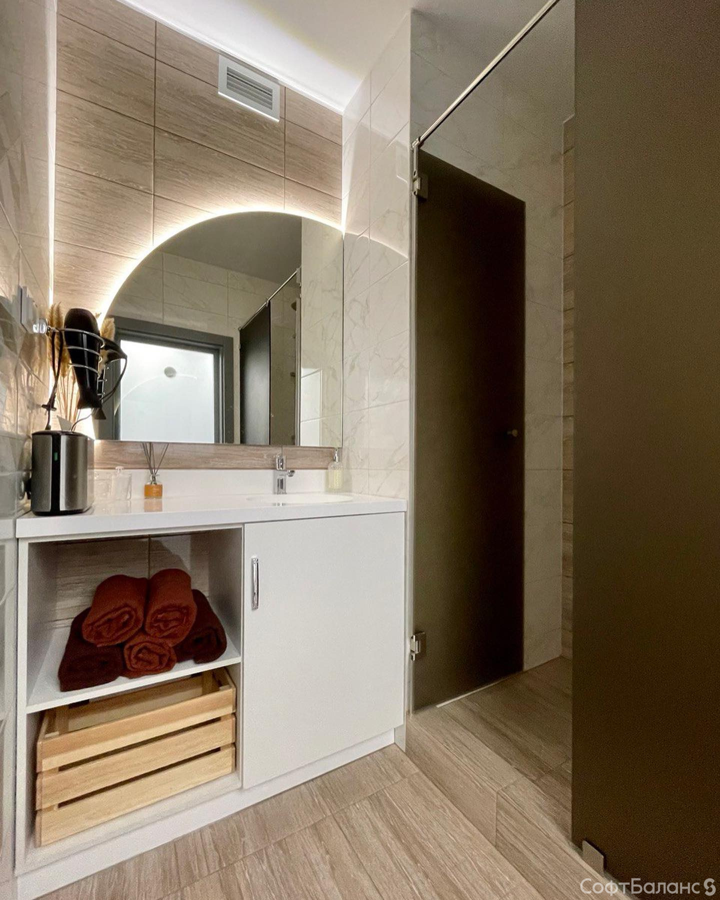 Душевая – особая гордость Оли и Саши, обязательно загляните туда, там очень красиво! А ещё ребята гордятся ресепшн и гостевым туалетом: потолок в нём тоже делали своими руками.